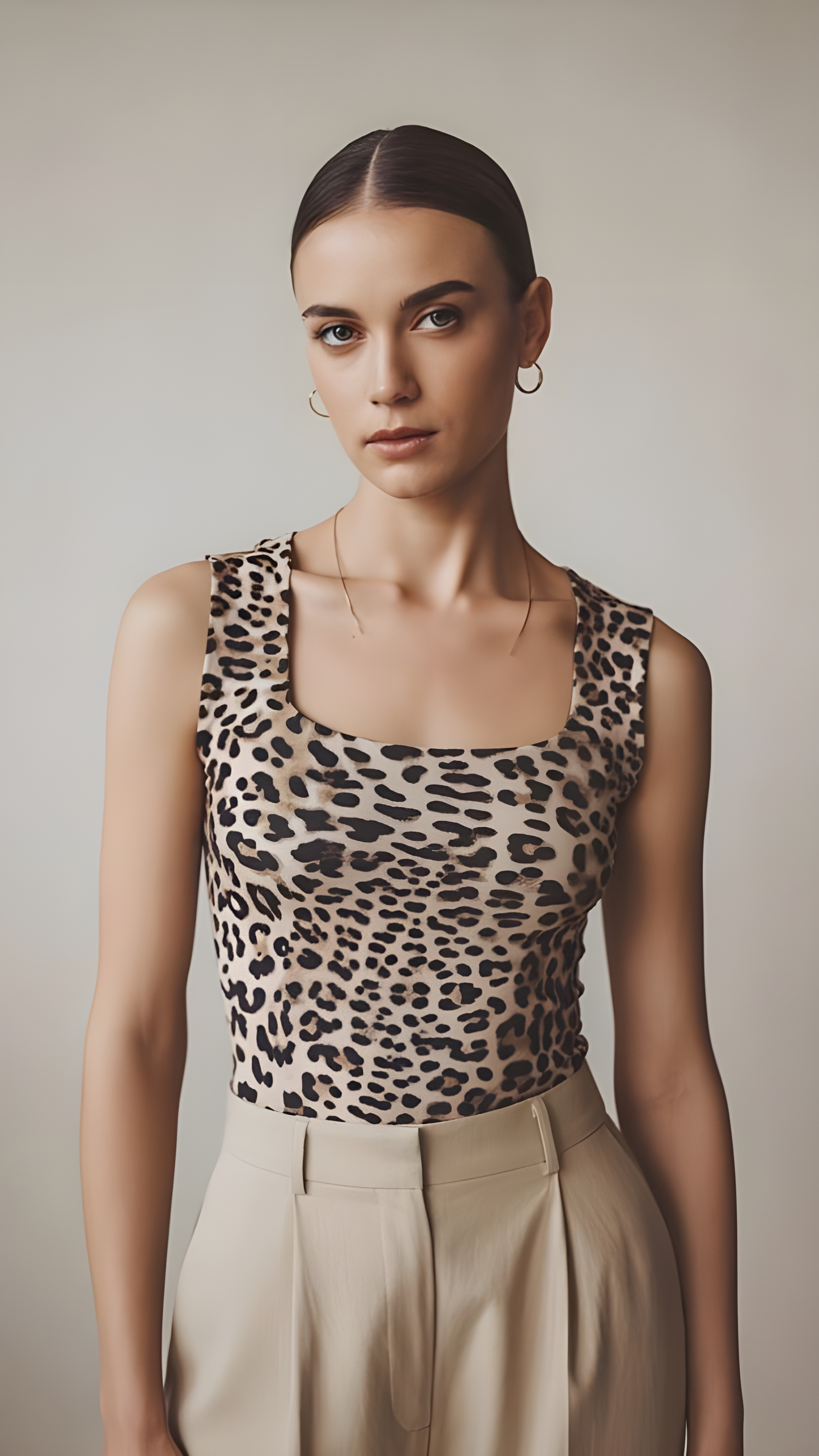 Blusa animal print de leopardo sin mangas con escote cuadrado y que se ajusta al cuerpo, resaltando la figura.