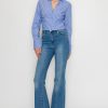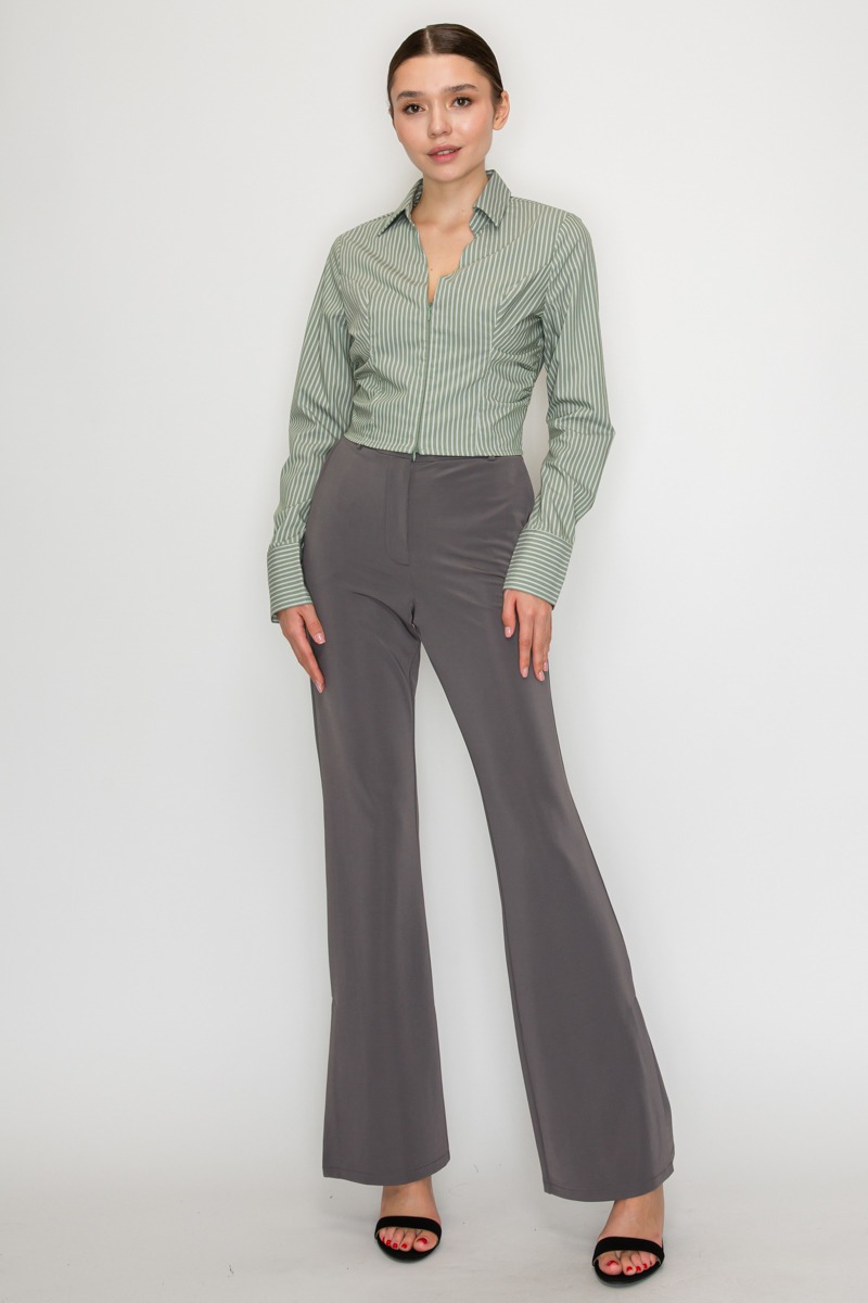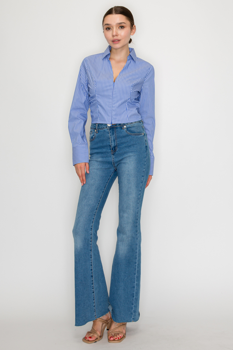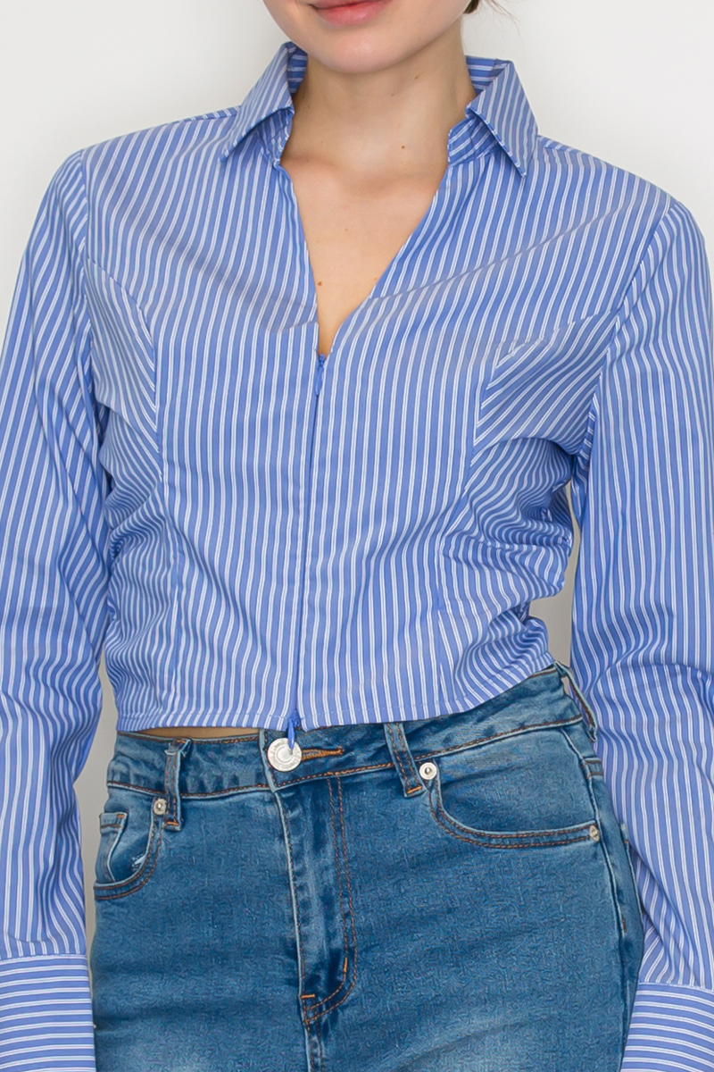 Blusa estilo camisa de manga larga con diseño de rayas verticales, cuenta con cuello estilo camisa, cierre en la parte de enfrente que llega hasta el busto. Perfecto para looks casuales y/o profesionales.