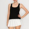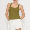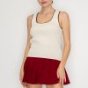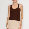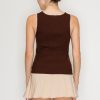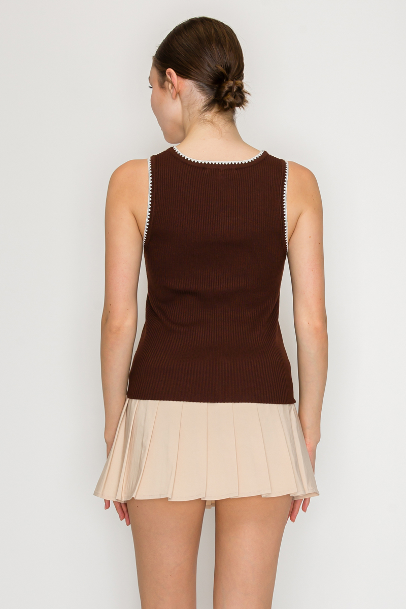 Blusa tricot sin mangas, con ribetes en forma de triángulos pequeños en el cuello y las sisas que contrastan con el tono base de la blusa.