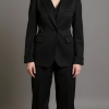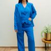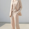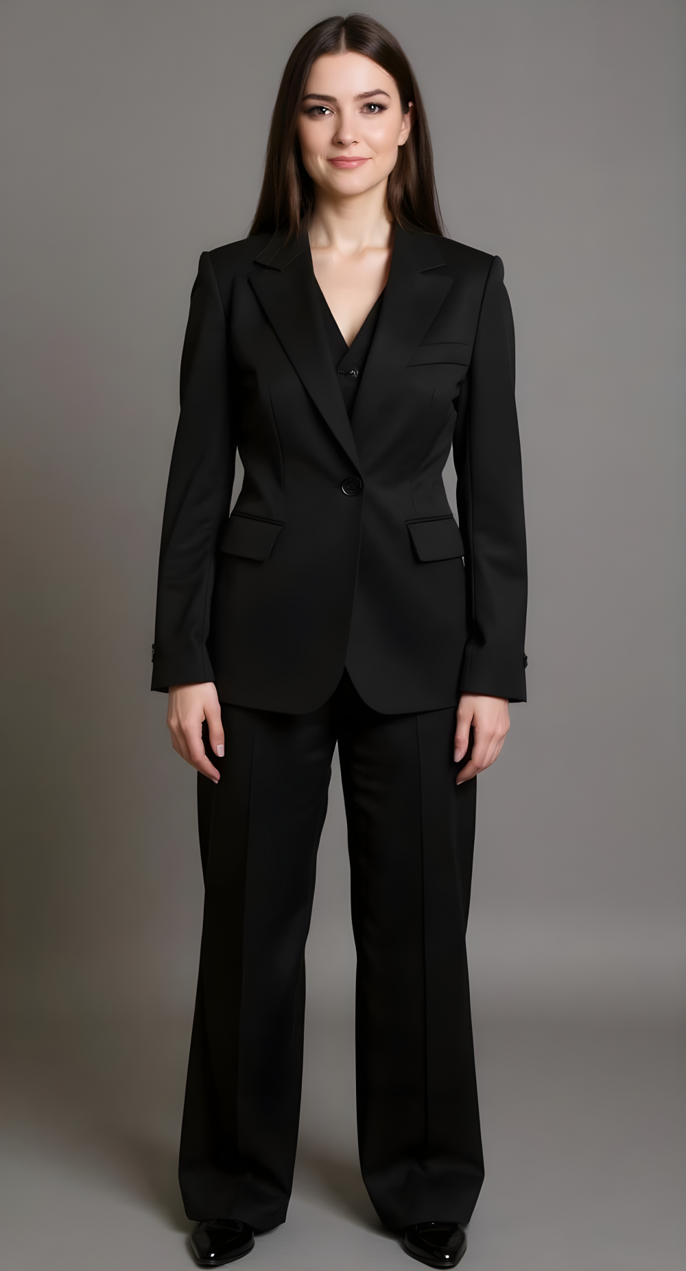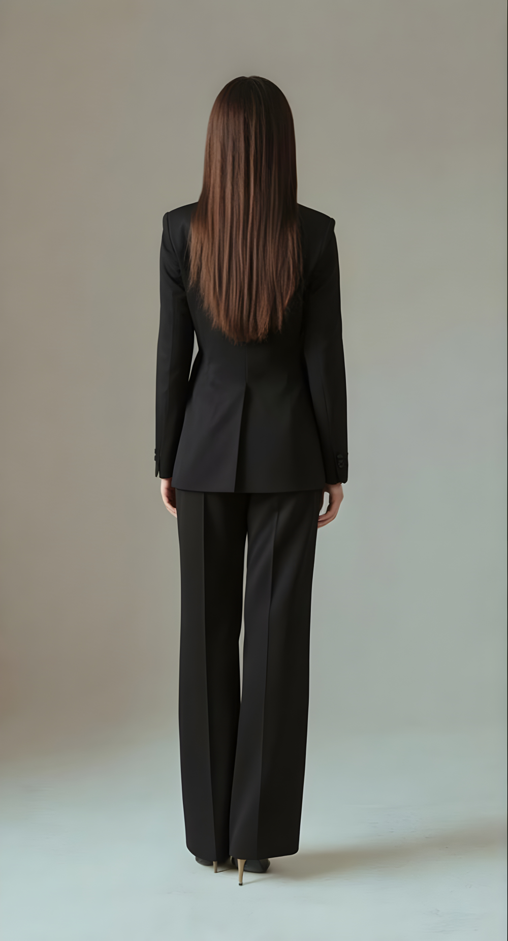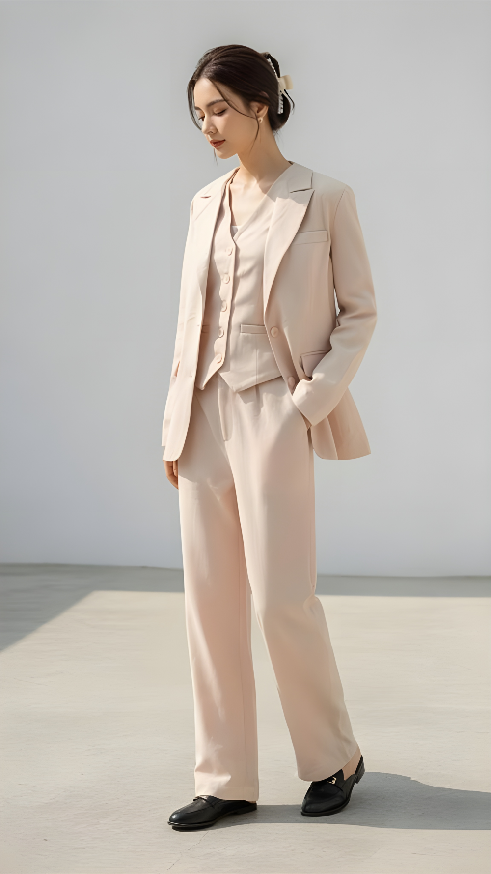 Conjunto sastre femenino y elegante de 3 piezas: saco estructurado, chaleco entallado y pantalón amplio de corte recto. Perfecto para entornos formales y/o profesionales.