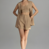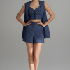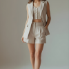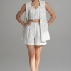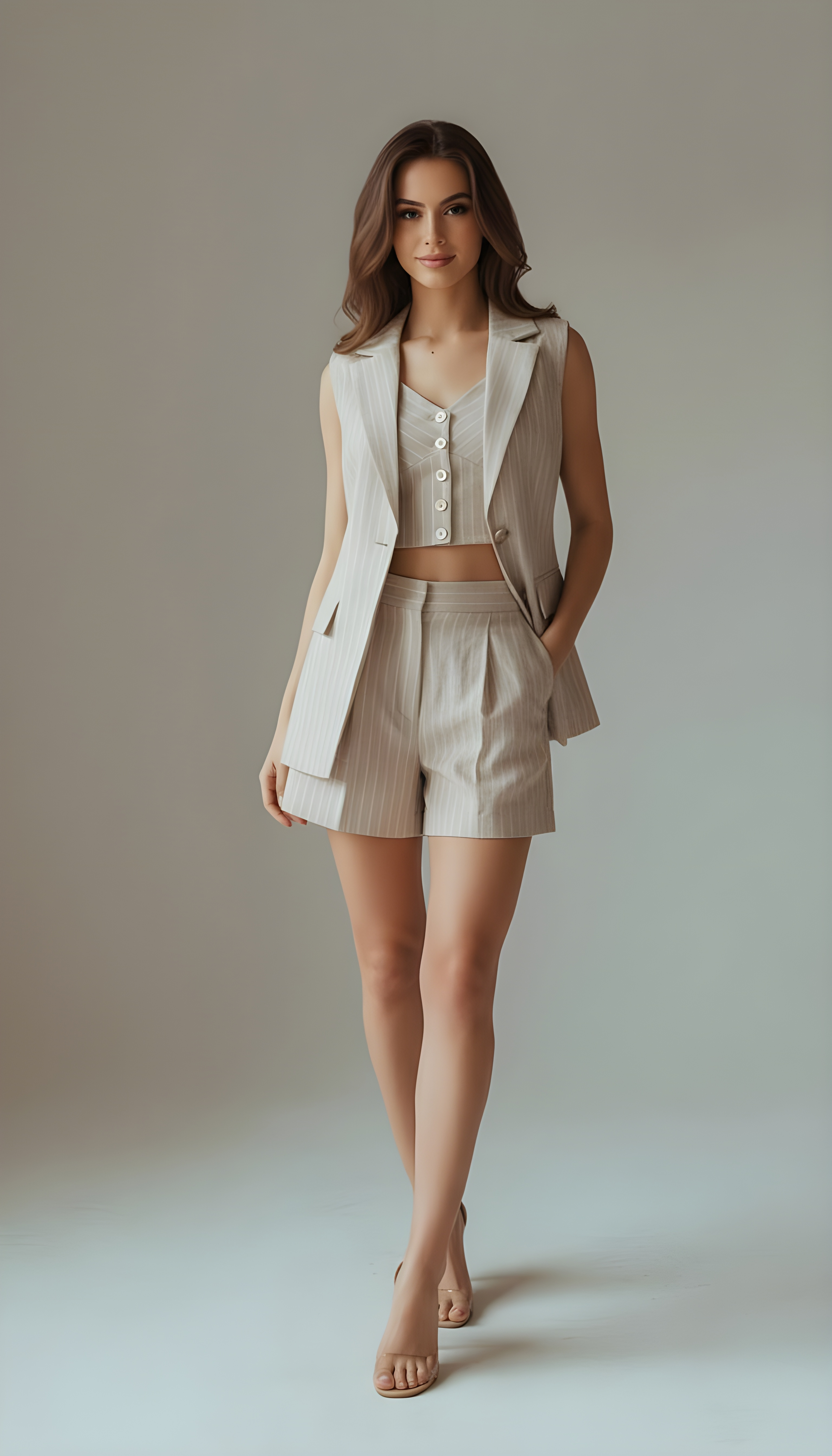 Conjunto compuesto por chaleco largo, top con botones al frente y short con pinzas, todo en tela fresca con finas líneas verticales que estilizan la figura. Perfecto para un look elegante y moderno, ya sea para oficina, eventos o salidas casuales.