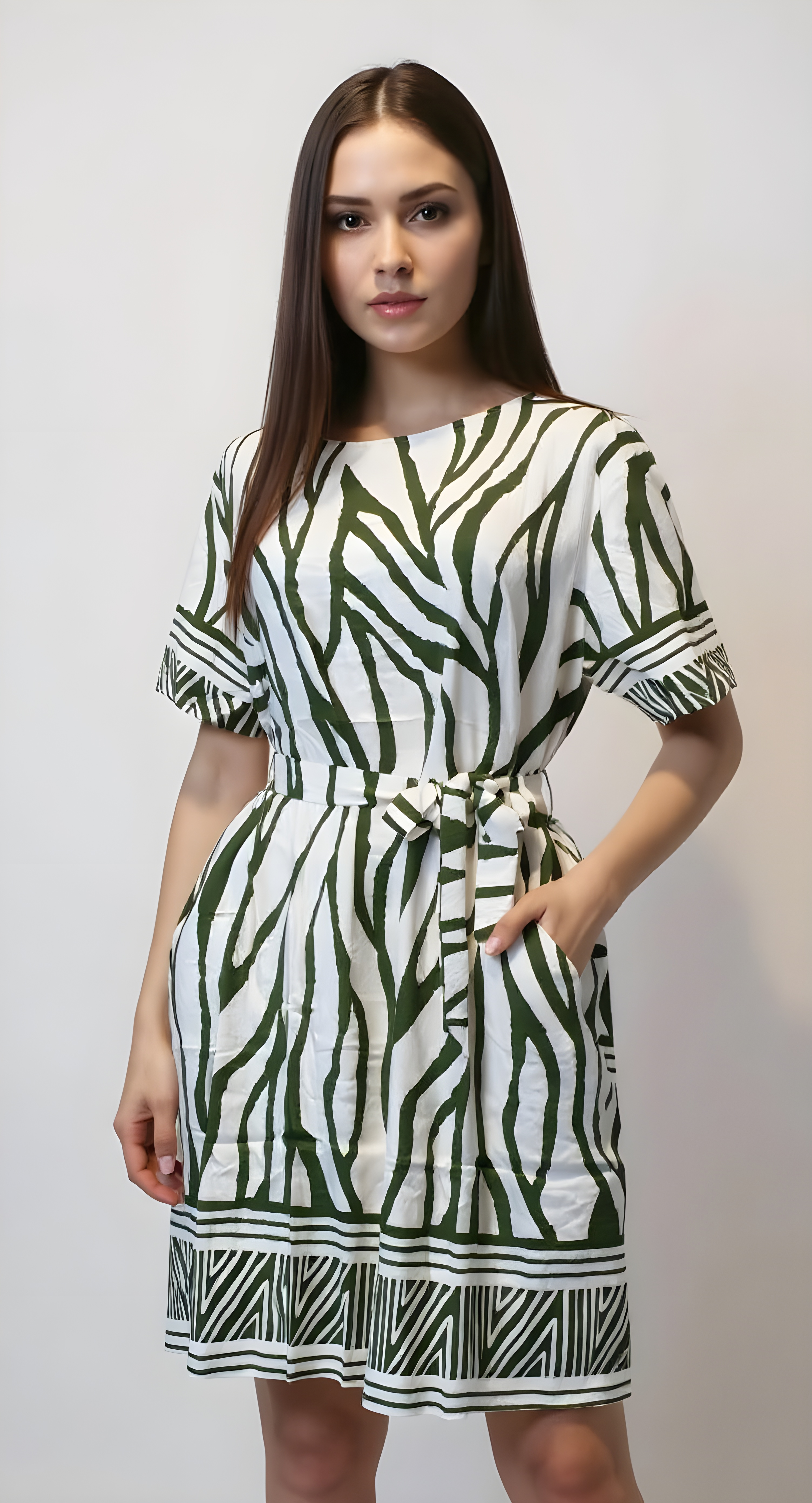 Incluye cinturón de la misma tela fresca con estampado de rayas de cebra.