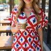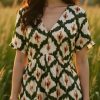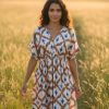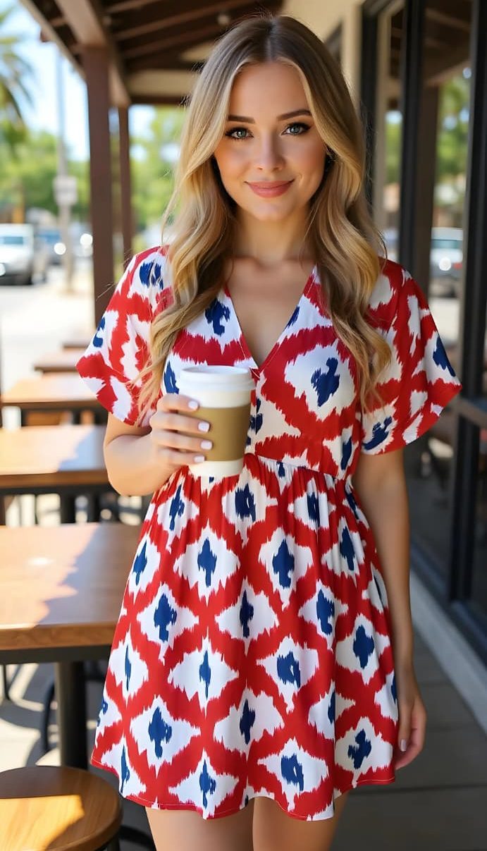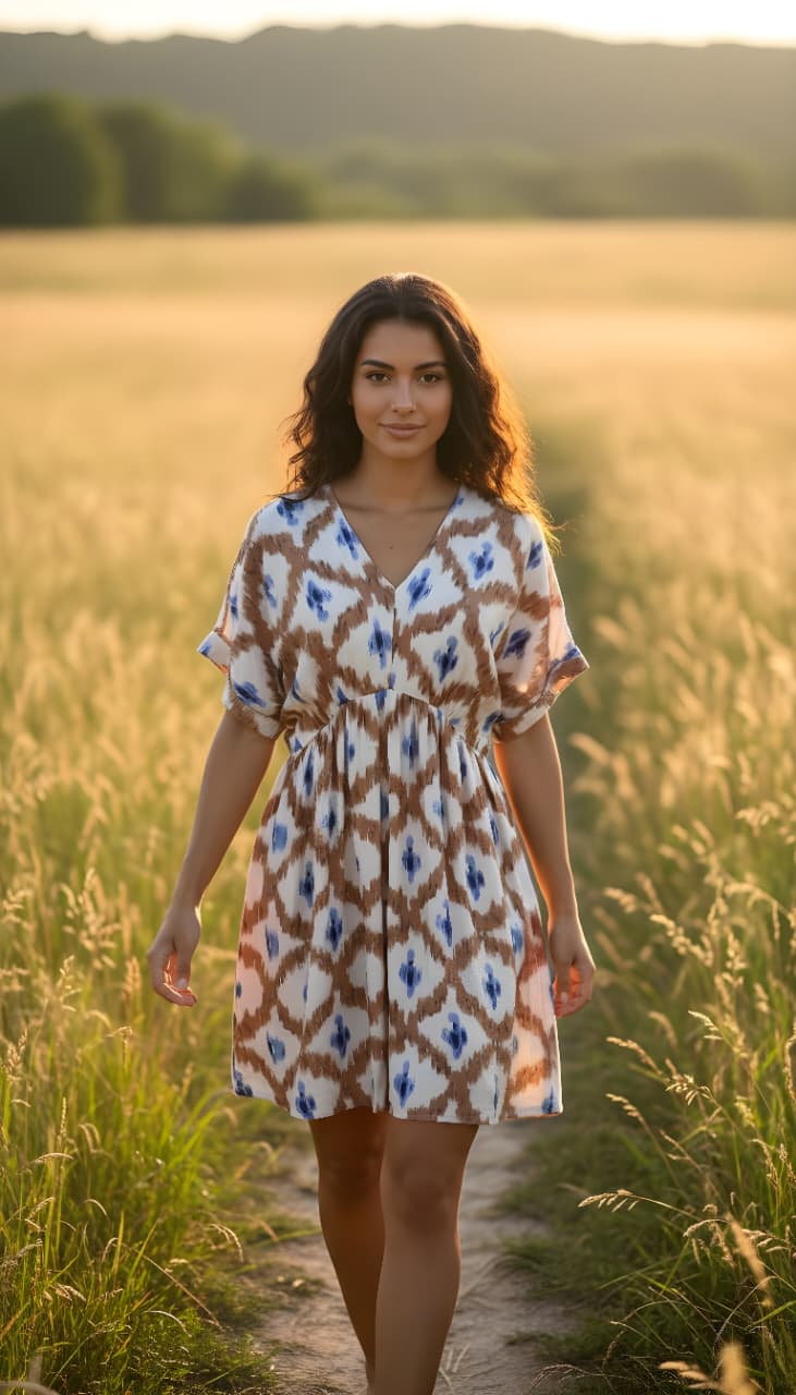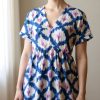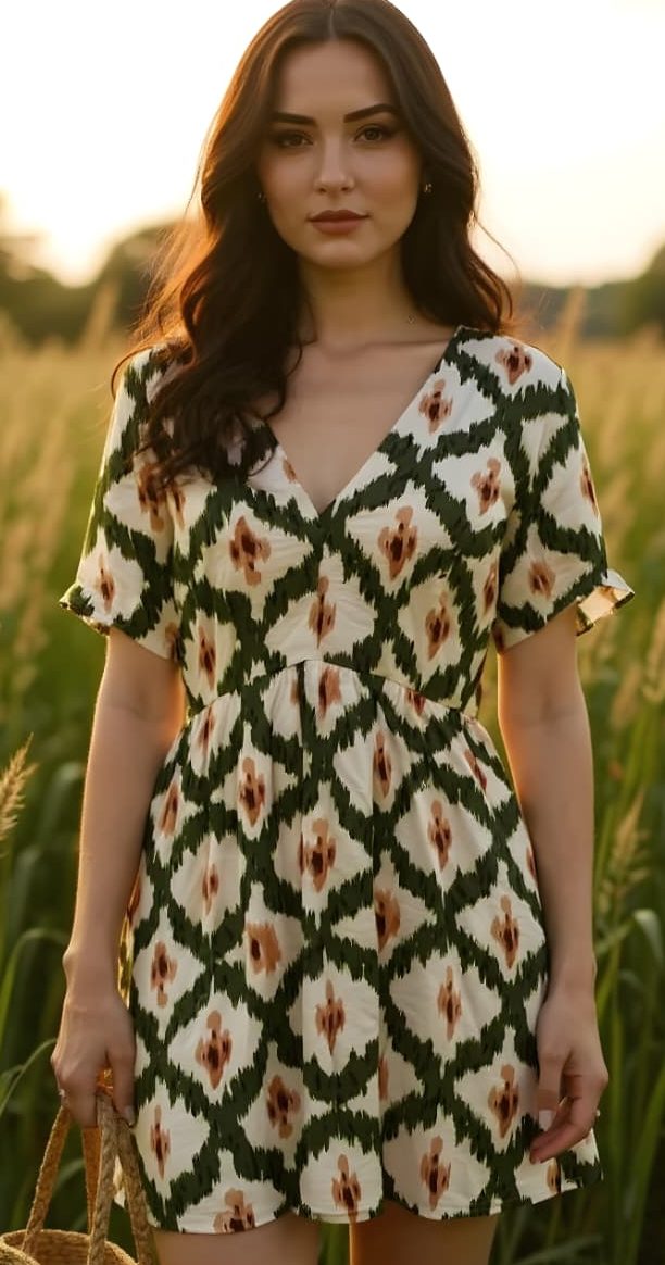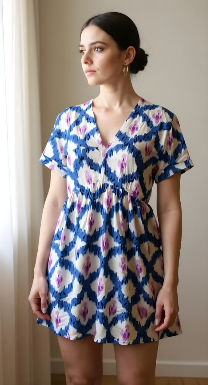 Vestido corto con estampado geométrico tipo ikat, en tonos azul, blanco y detalles en morado.Tiene un escote en “V”, manga corta suelta, le da un toque fresco y cómodo, ideal para climas cálidos o salidas casuales
